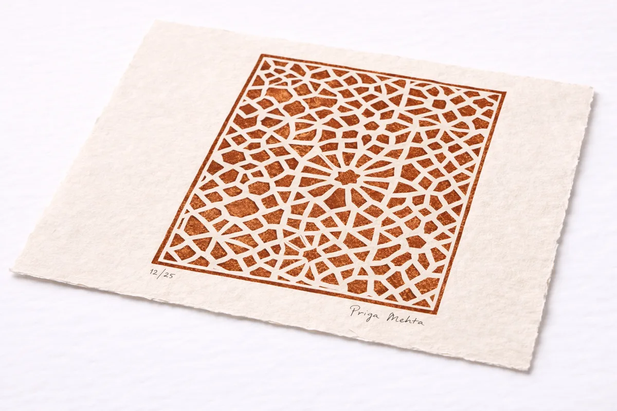 Small woodblock print exploring the geometric patterns found in the latticed windows of Amber Fort. Printed in a single color of burnt sienna ink on cream washi. Edition of twenty-five.
