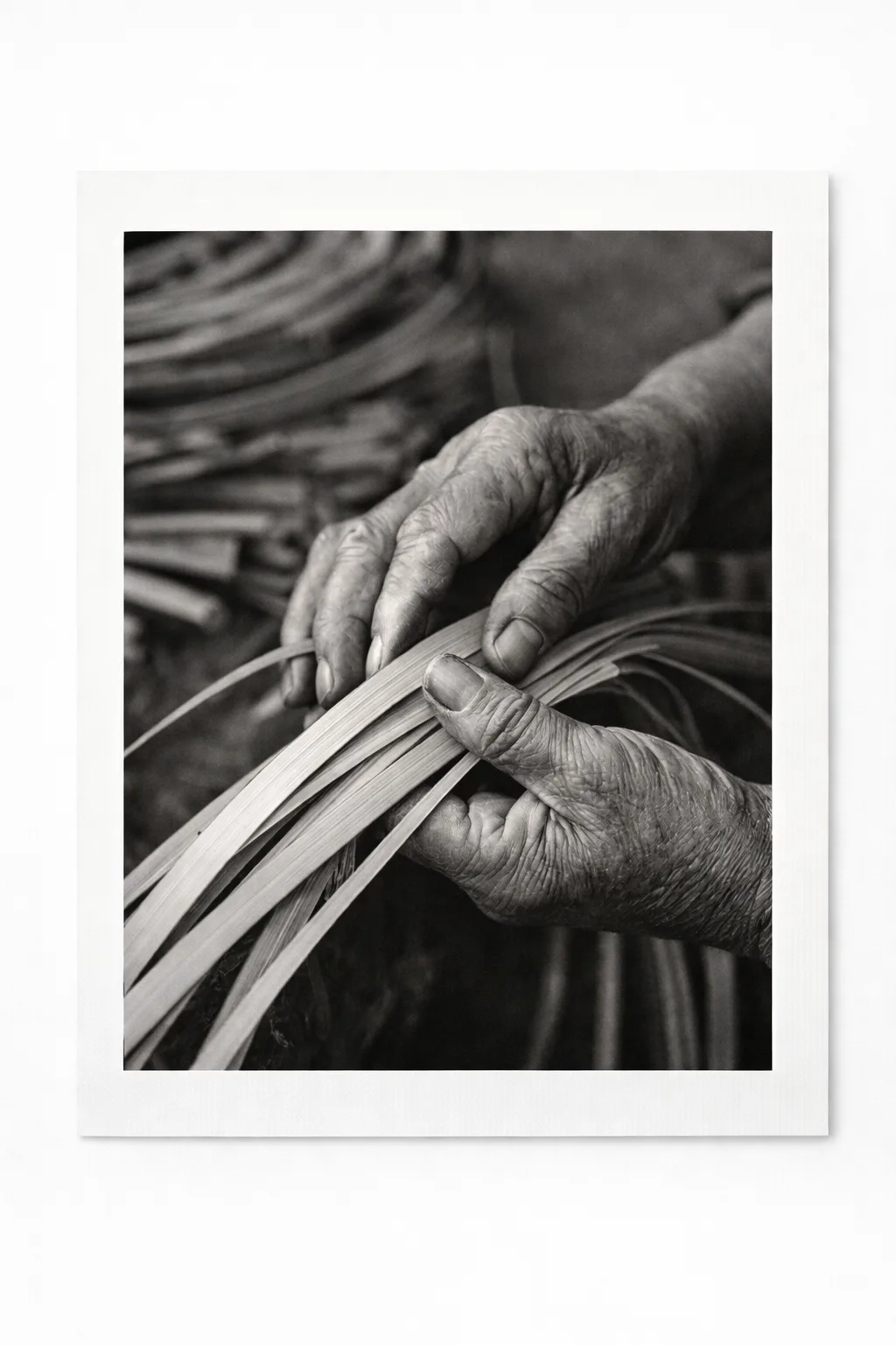 Black and white photograph of a Cherokee basket weaver's hands selecting river cane strips. Shot on medium-format film and hand-printed as a silver gelatin print. The close-up perspective honors the knowledge held in these hands. Printed with archival selenium toning.