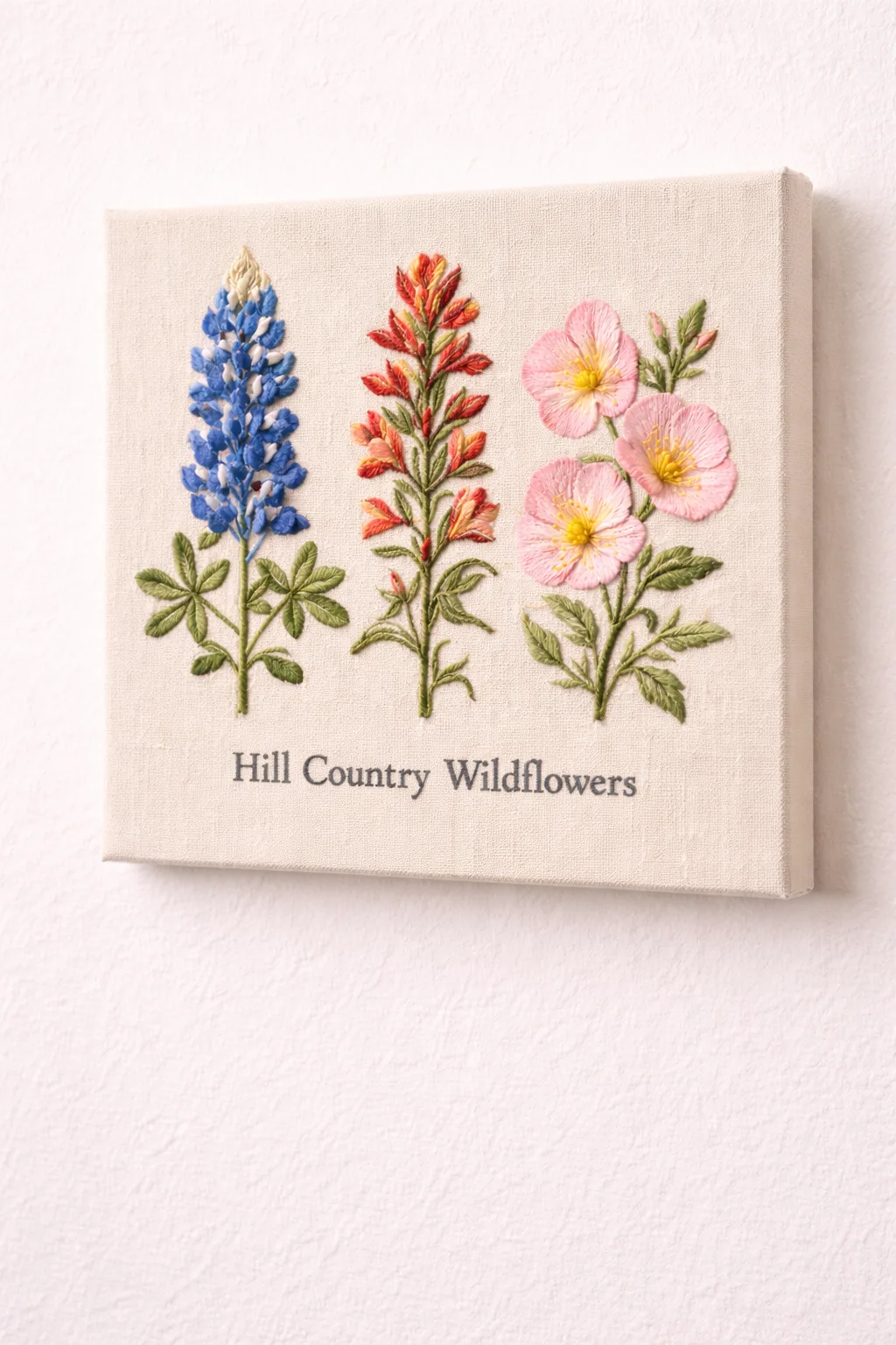 Embroidered linen sampler of Texas Hill Country wildflowers — bluebonnets, Indian paintbrush, and evening primrose. Each flower is rendered in long and short stitch with hand-dyed cotton floss. A contemporary take on the Victorian botanical sampler tradition.