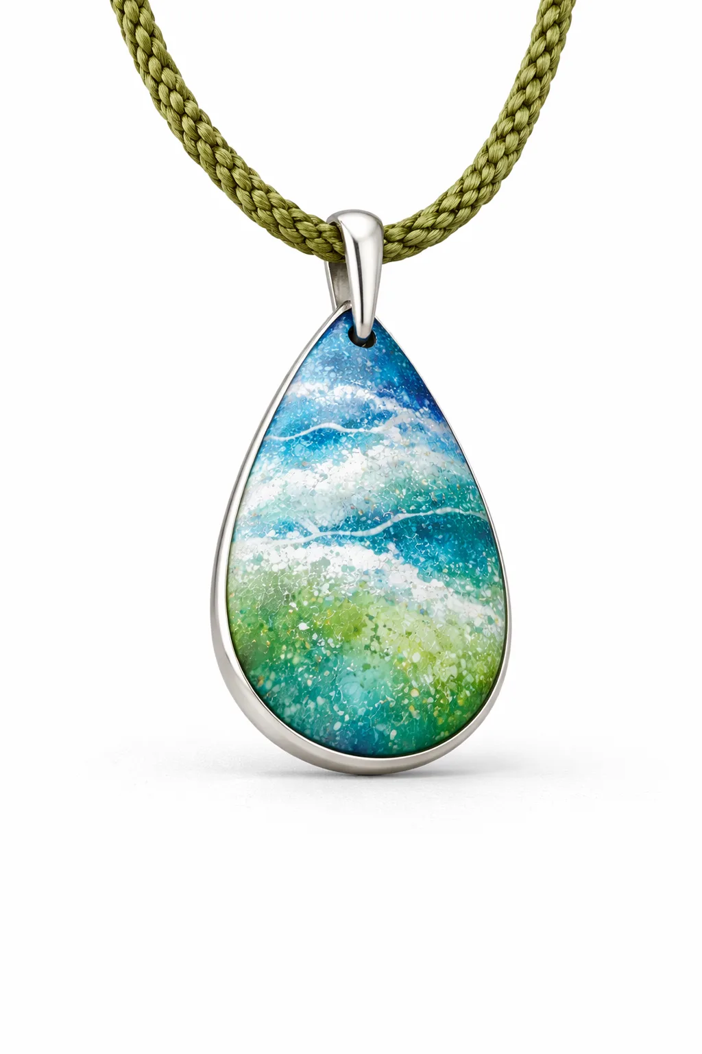 Pendant featuring layered enamel in blues and greens evoking the spring melt on the Winooski River. Three firings build depth and luminosity. Hung on a hand-braided silk cord in moss green.