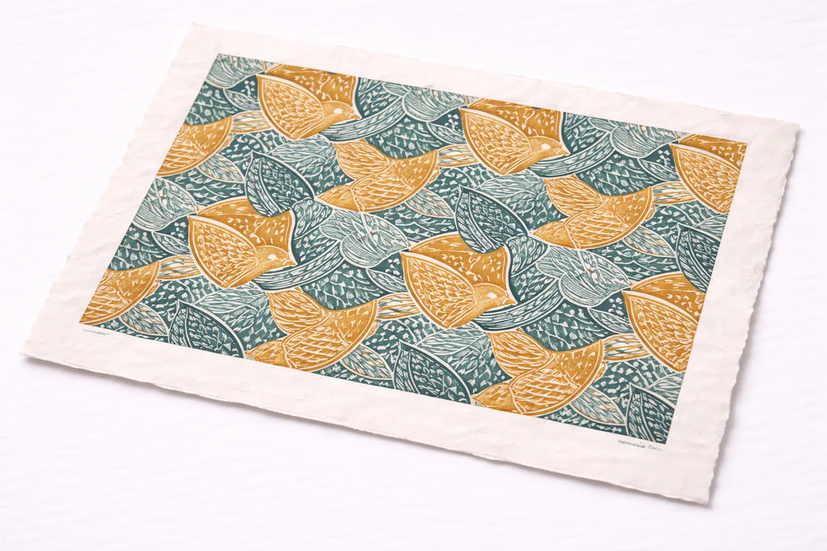 Hand-carved woodblock print on Japanese washi paper, edition of fifteen. Overlapping bird forms create a dense lattice pattern inspired by Rajasthani jali screens. Printed in two colors using water-based inks.