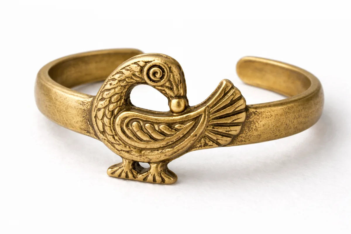 Lost-wax cast brass cuff bracelet inspired by the Sankofa symbol. The cuff features a stylized bird form reaching backward, cast from a hand-carved wax original. Finished with a brushed patina that highlights the texture of the wax carving process.