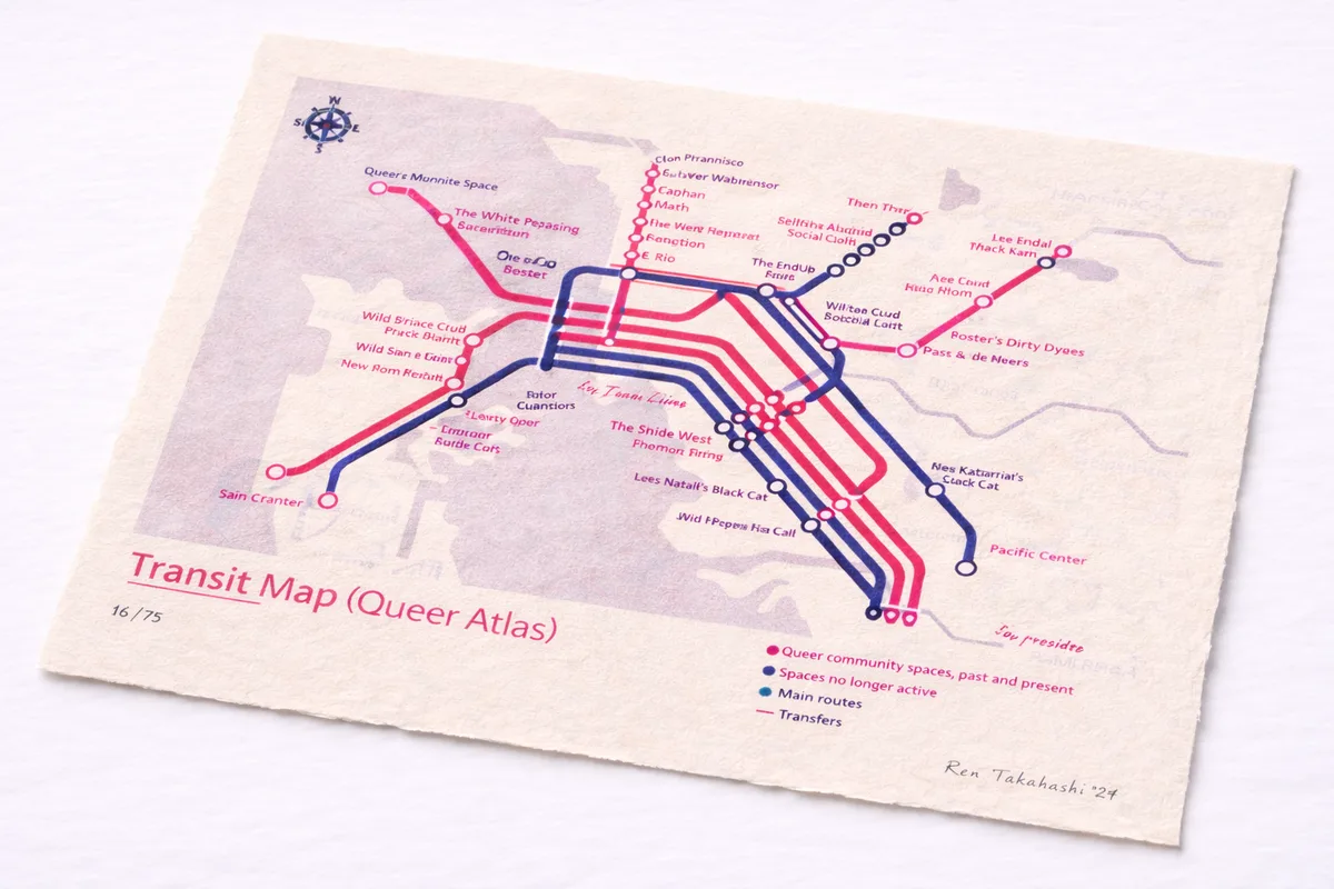 Two-color risograph print reimagining the Bay Area transit map as a network of queer community spaces, past and present. Printed in soy-based ink on Japanese newsprint. Edition of seventy-five.