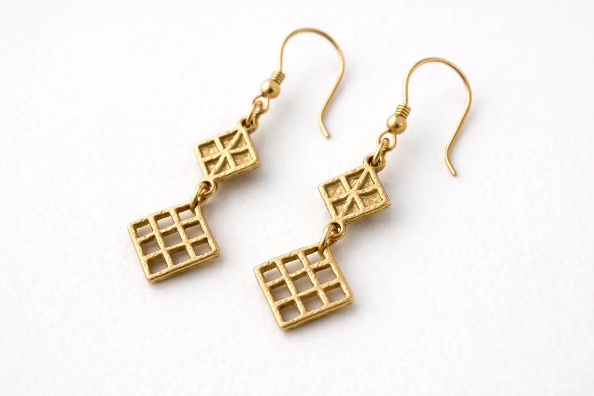 Pair of drop earrings cast in recycled gold-filled wire, inspired by the geometric patterns of Akan goldweights. Each earring is a unique casting from a hand-carved wax original. French wire ear hooks in 14k gold-filled.