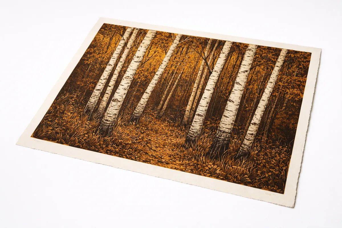 Large-format woodcut of a stand of white birch trees in autumn. The pale trunks are left as the unprinted paper, while the surrounding forest is rendered in warm amber and deep brown. Reduction print from cherry plywood. Edition of fifteen.