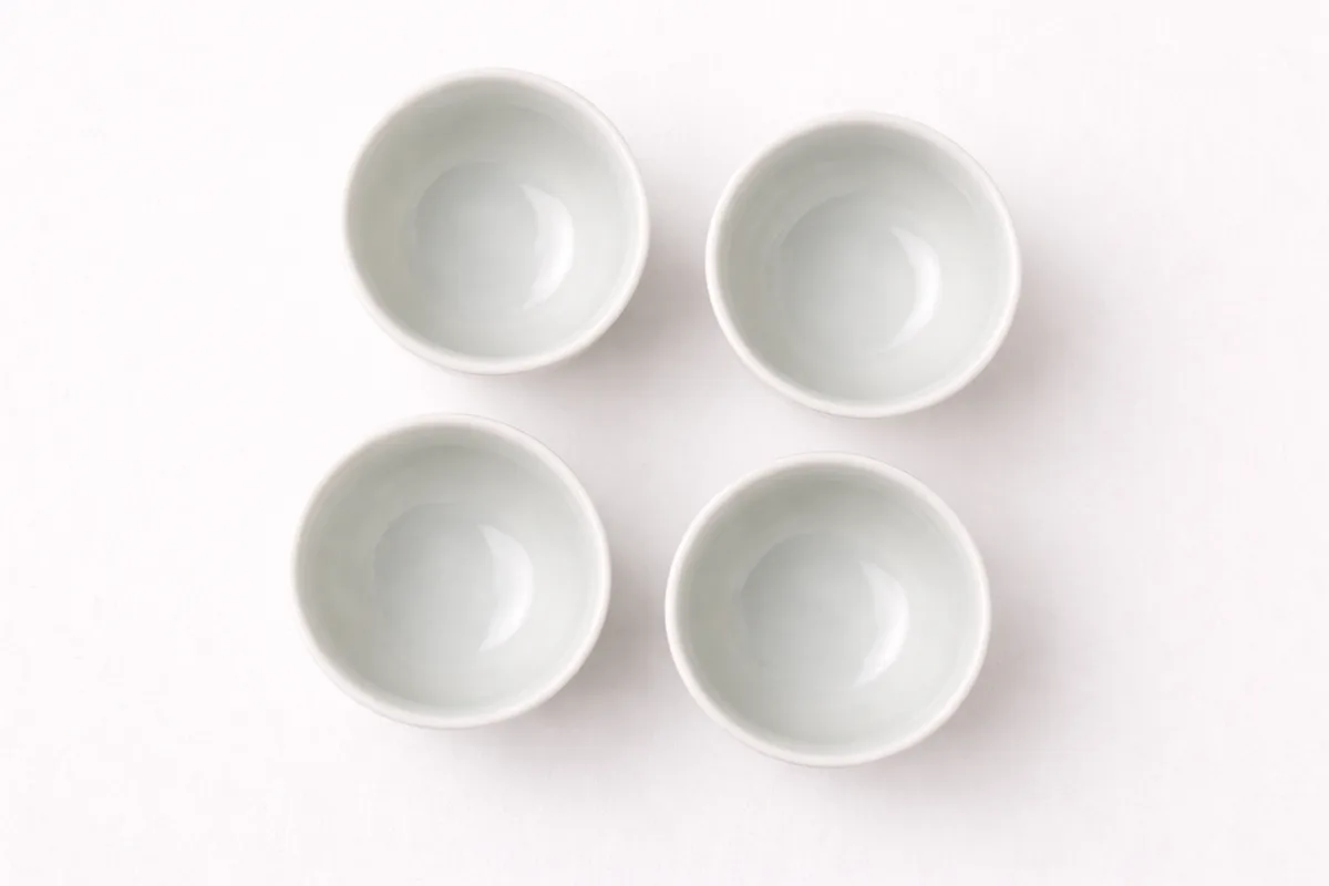 Set of four hand-thrown porcelain tea cups with a translucent white glaze. Each cup is slightly different in height and diameter, following the Korean aesthetic of intentional variation within a set.