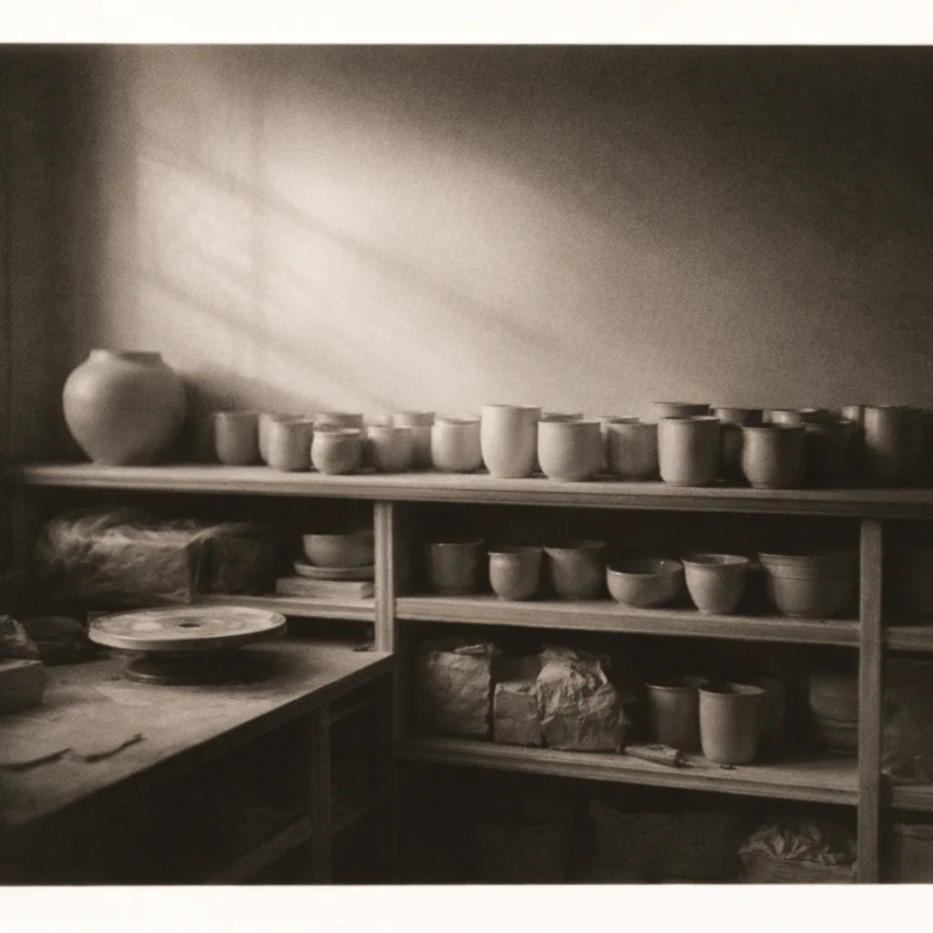 Intimate photograph of the artist's studio in winter, with low afternoon light raking across shelves of unfired vessels. The long exposure renders the slowly shifting light as a soft, luminous haze. Selenium-toned silver gelatin.