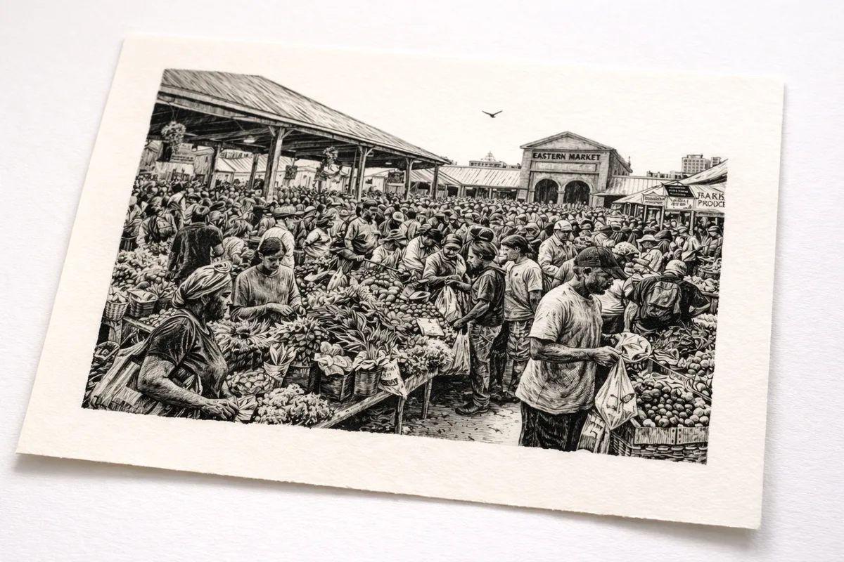 Large brush and ink illustration of Detroit's Eastern Market on a bustling Saturday morning. Vendors, shoppers, and produce stalls create a dense, energetic composition. The drawing took three weeks of on-site sketching to complete.