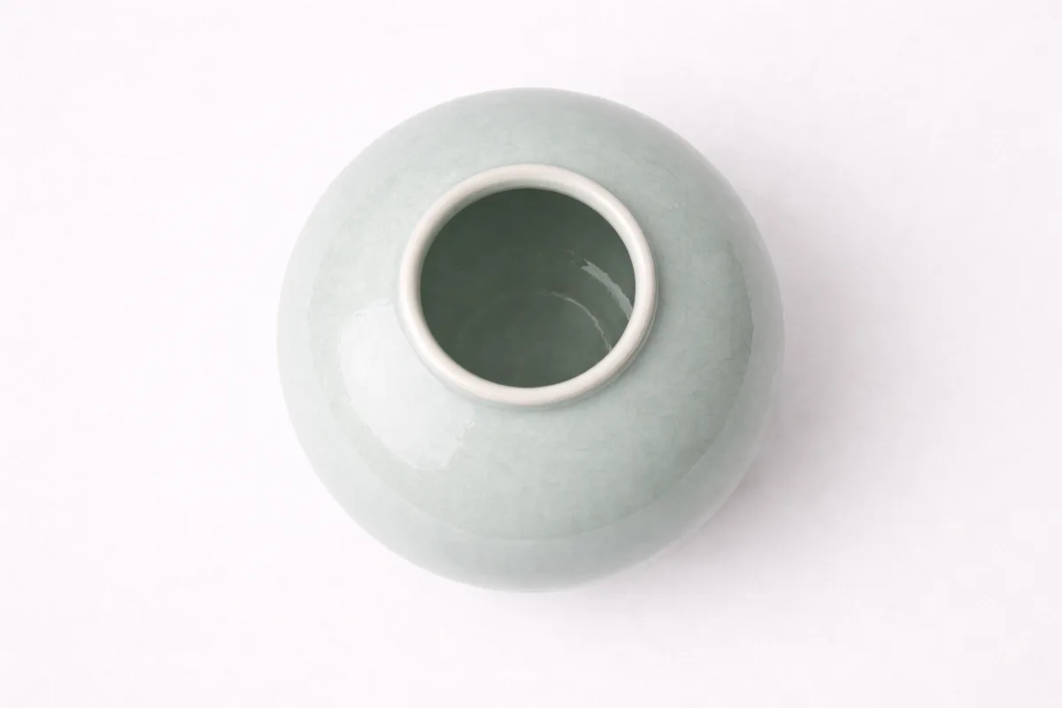 Hand-thrown porcelain moon jar with celadon glaze. The traditional Korean form is slightly asymmetrical, reflecting the artist's embrace of imperfection. Functional as a vase or beautiful as a standalone sculptural object.