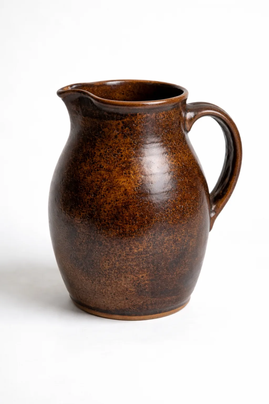 Hand-thrown stoneware pitcher with a rich iron-saturated glaze. The form references historical stoneware produced by enslaved potters in Edgefield, South Carolina. A pouring lip and pulled handle make this a fully functional piece. Dishwasher and microwave safe.