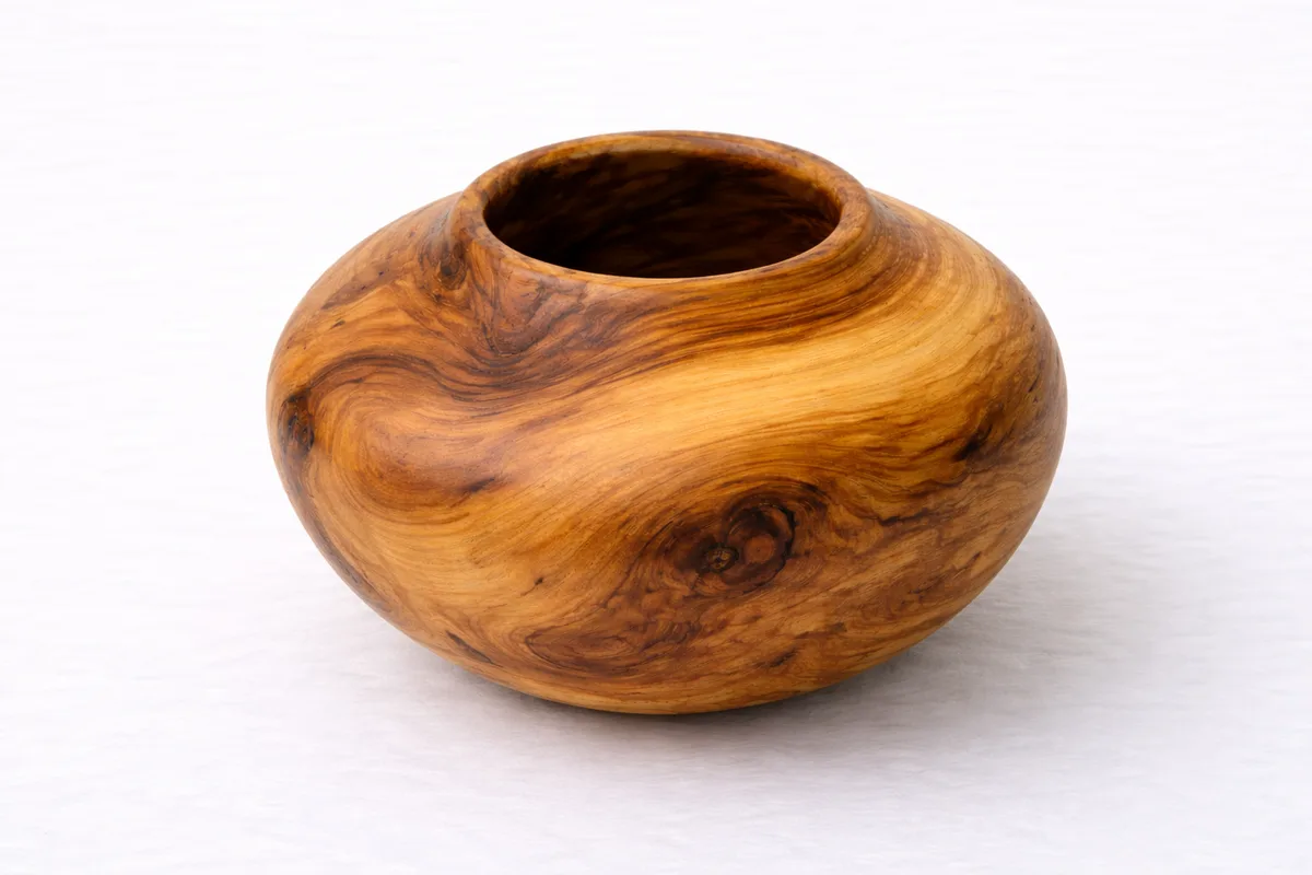 Hand-carved bowl from reclaimed juniper wood. The natural grain and aromatic quality of the wood are preserved through a food-safe oil finish. The form references traditional Pueblo seed jars translated into wood.