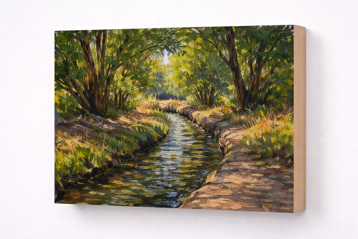 Small-scale oil study of an irrigation ditch winding through cottonwood trees. Painted en plein air near the Santa Cruz River. Loose brushwork captures dappled sunlight on moving water. Unframed on cradled panel.