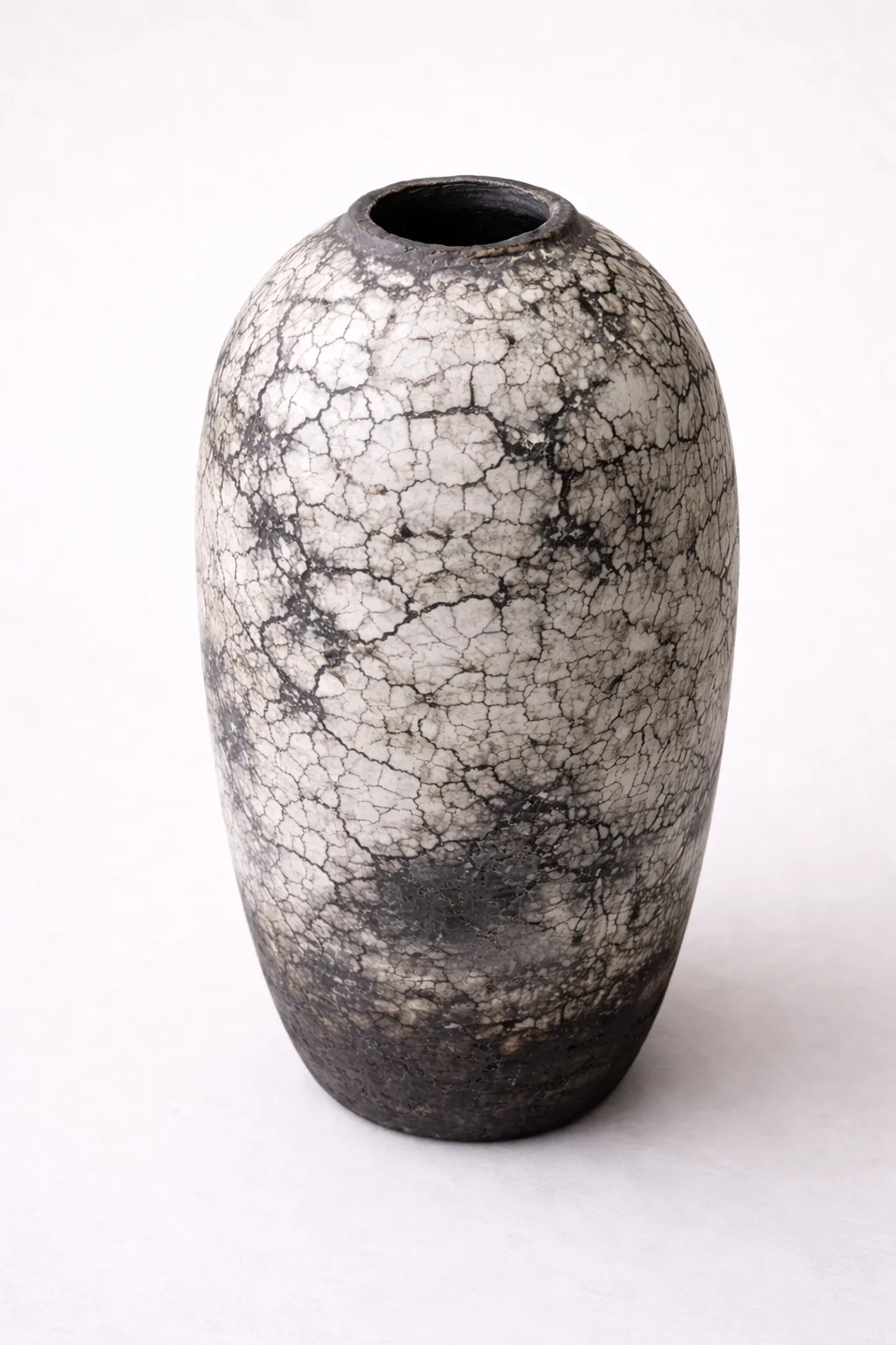 Tall hand-built raku vessel with a white crackle glaze over a dark clay body. The carbon trapped in the glaze crackle creates dark lines on the white surface, evoking the surface of the moon. Not watertight — intended as a sculptural object.