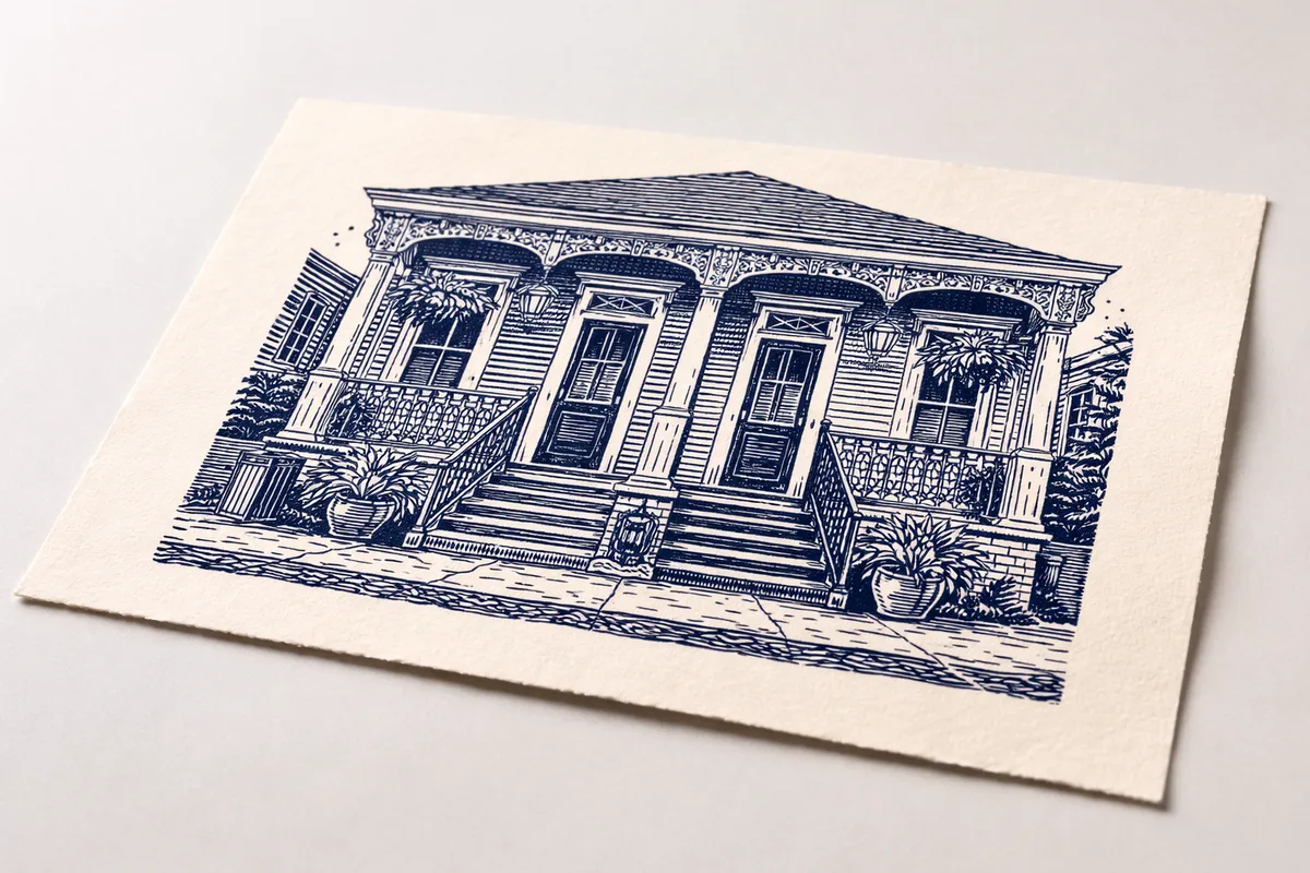 Hand-carved linocut print depicting the iconic shotgun house form of the Tremé neighborhood. Printed in a single color of deep indigo on cream Rives BFK. The carved linoleum block captures the decorative millwork and iron railings characteristic of the neighborhood.