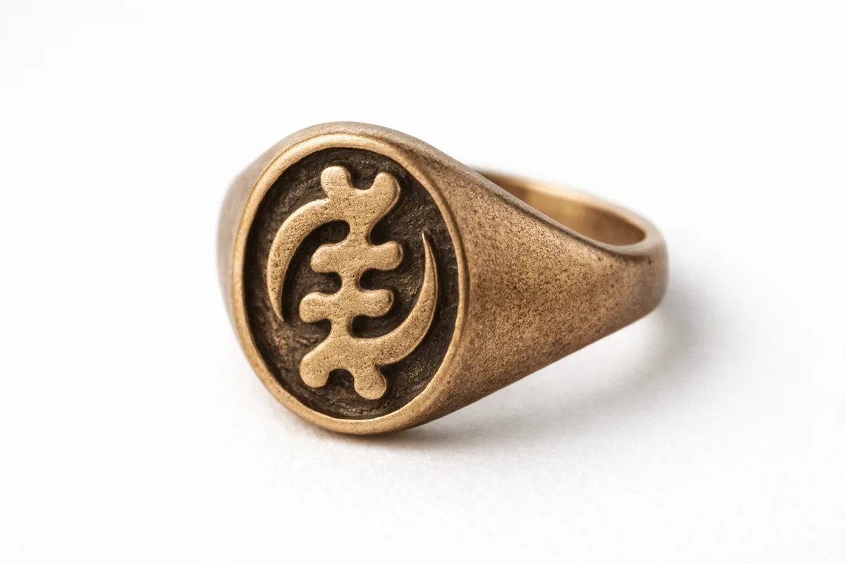 Signet-style ring cast in bronze featuring the Gye Nyame symbol, meaning "except God" in Akan philosophy. The ring face is carved with fine detail from a wax original, with a comfortable band width for everyday wear.