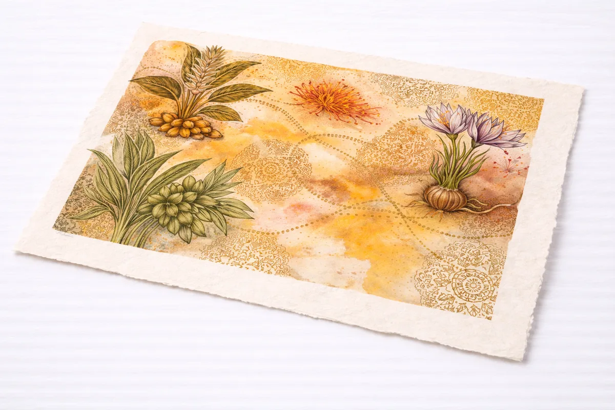 Mixed media painting combining watercolor washes with hand-printed woodblock elements. Botanical illustrations of turmeric, cardamom, and saffron float across a field of warm ochre, mapping the historic spice trade routes.