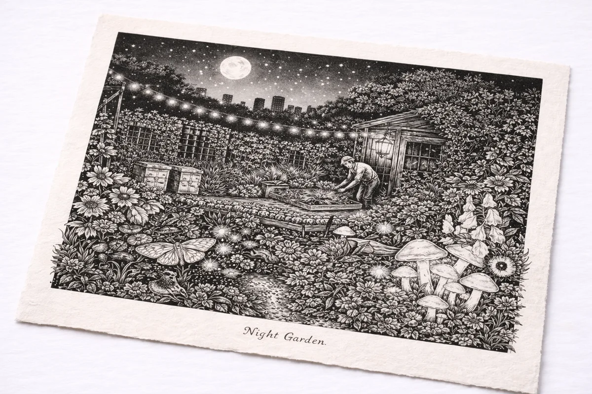 Hand-drawn ink illustration of a nighttime community garden teeming with nocturnal insects and glowing fungi. Original drawing in archival ink on hot-pressed watercolor paper. One of a kind.