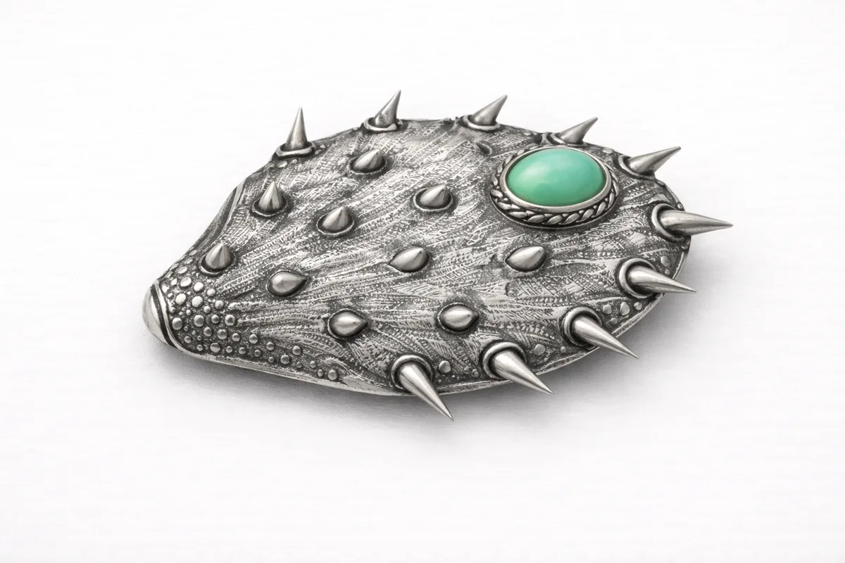 Hand-fabricated sterling silver brooch in the form of a prickly pear cactus pad. The surface is chased and repoussé to create dimensional thorns and texture. Set with a small oval of chrysoprase suggesting the green flesh of the fruit.