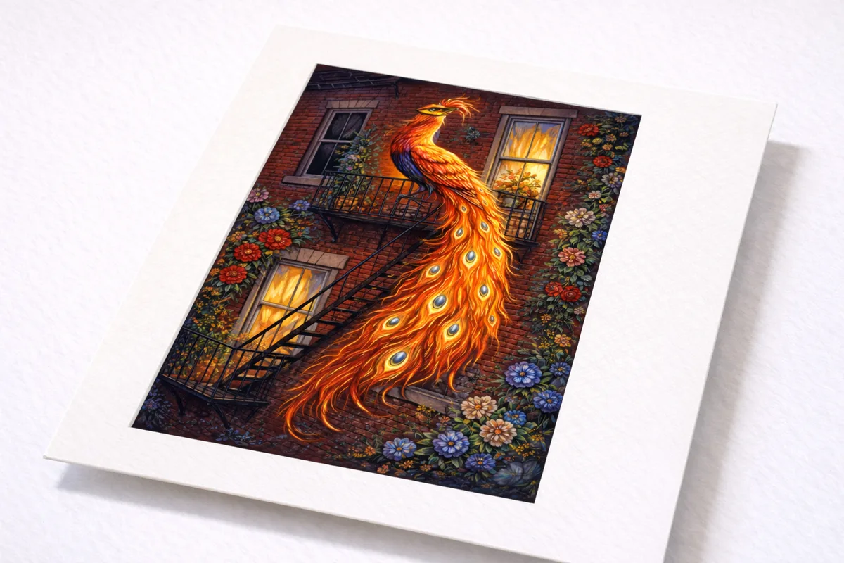 Large gouache painting reimagining the Slavic firebird legend in a contemporary Philadelphia rowhouse setting. Rich jewel tones of crimson, gold, and sapphire. The bird perches on a fire escape, its tail feathers trailing down the brick facade.