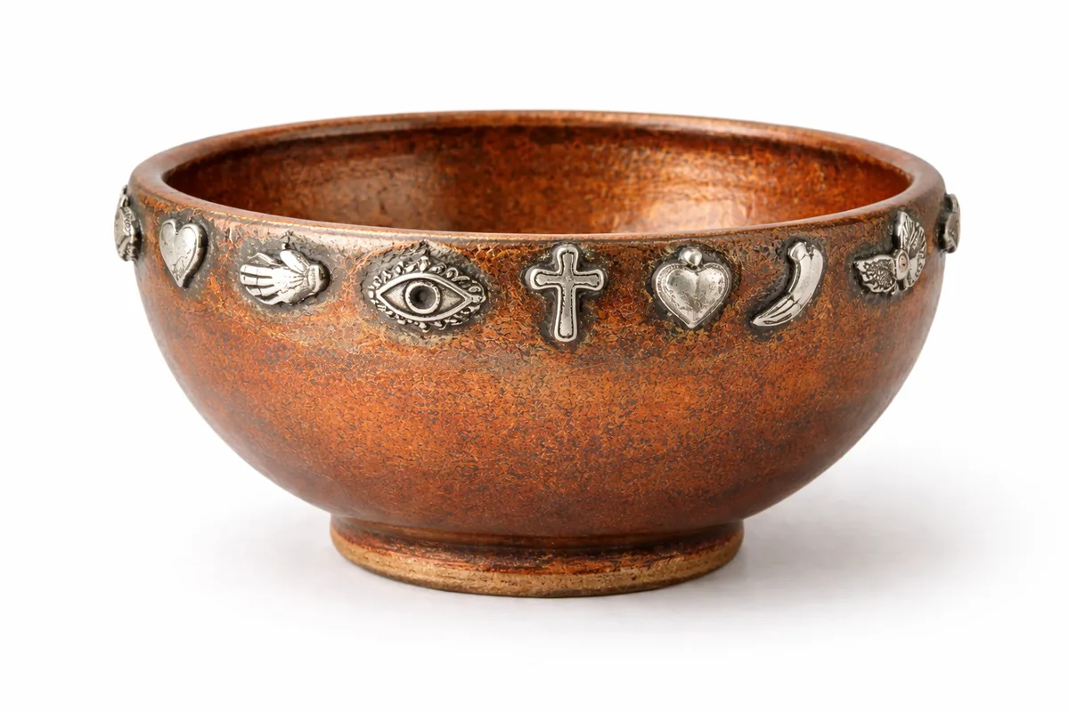 Hand-thrown earthenware bowl with copper glaze and small sterling silver milagro charms pressed into the rim before firing. The bowl form references Oaxacan chocolate vessels while the milagros connect to the folk art tradition of devotional offerings.