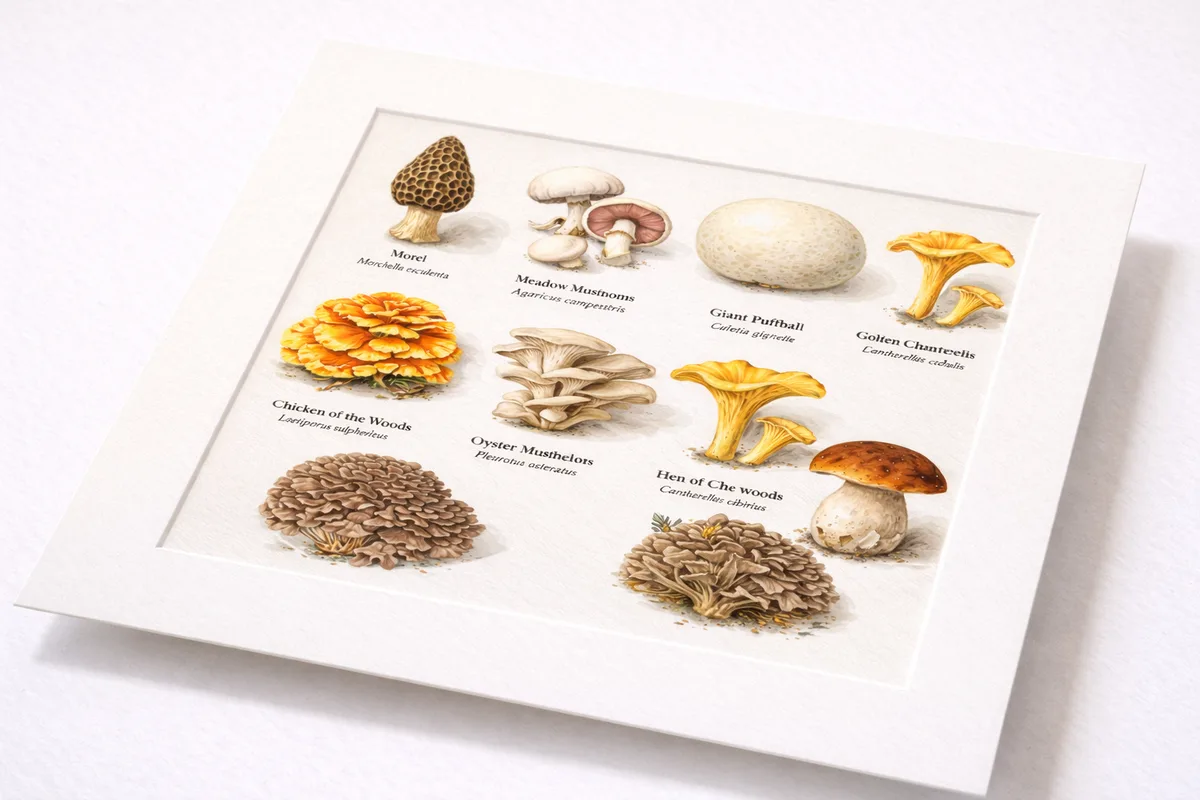 A set of eight gouache illustrations of edible mushrooms found in eastern Pennsylvania forests. Each mushroom is rendered with scientific accuracy and labeled with common and Latin names. Sold as a complete set, matted but unframed.