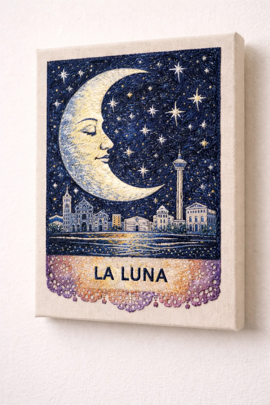 Hand-embroidered linen depicting a reinterpretation of the La Luna lotería card. Dense satin stitch in midnight blue, silver metallic thread, and pale yellow create a luminous moon over a San Antonio skyline. Mounted on wooden stretcher bars. Over sixty hours of hand stitching.