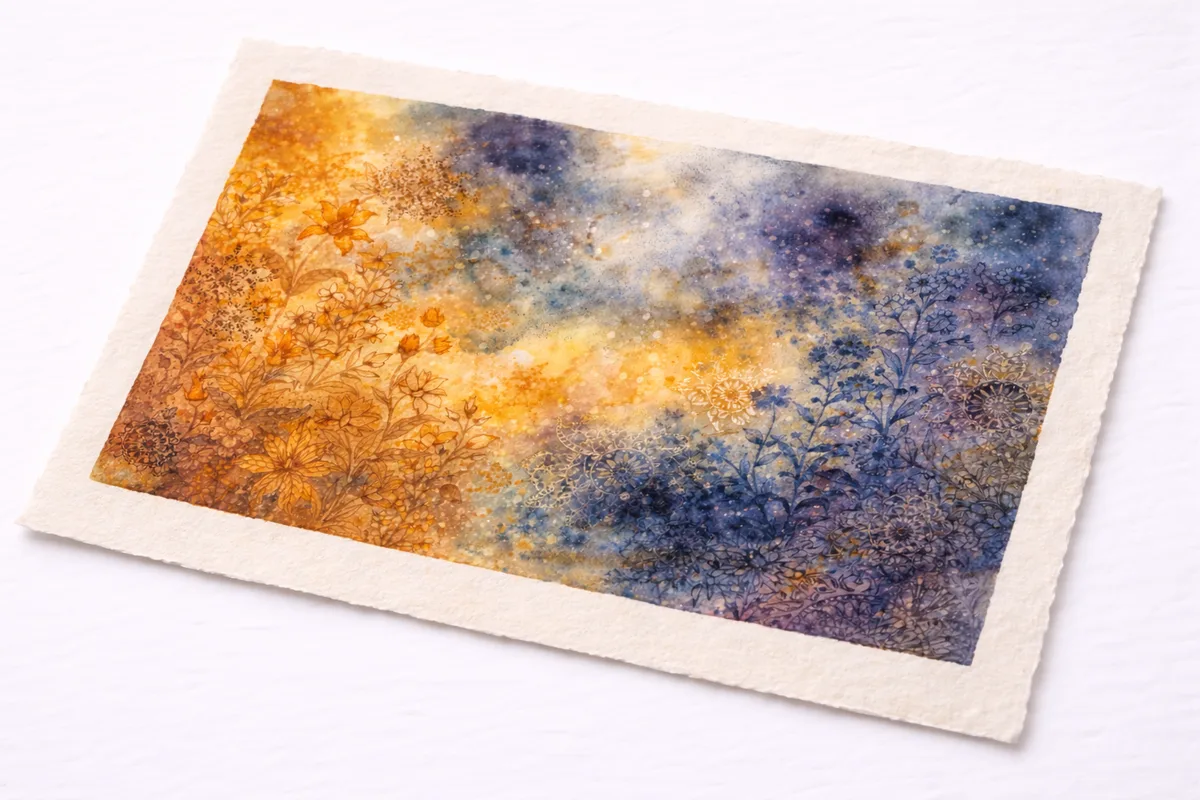 Watercolor and gouache painting on handmade Khadi paper. Intricate botanical forms inspired by Mughal garden miniatures dissolve into abstract washes of indigo and saffron. The composition unfolds like a map of inherited memory.